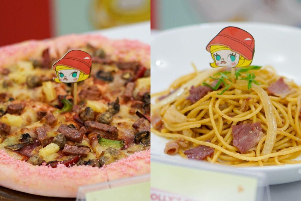 Molly’s Pink Pizza dengan warna pink ikonik yang merefleksikan sisi dreamy Molly, lembut namun percaya diri, seperti ekspresinya yang khas dan penuh karakter dengan warna pink yang menonjol. Ada juga Molly’s Pink Blossom Pizza berbentuk bunga dengan pinggiran keju, white cheese volcano, taburan pink garlic crumbs & topping spesial cheese brulee, US beef short plate, onion & saus bechamel. -