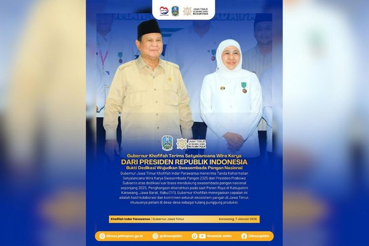 Gubernur Jawa Timur, Khofifah Indar Parawamsa, menerima penghargaan Tanda Kehormatan Satyalancana Wira Karya Swasembada Pangan 2025 dari Presiden RI, Prabowo Subianto. Penghargaan ini diberikan dalam acara Panen Raya dan Pengumuman Swasembada Pangan yang digelar di Halaman Kantor Kecamatan Cilebar, Kabupaten Karawang, Jawa Barat, pada Rabu (7/1).