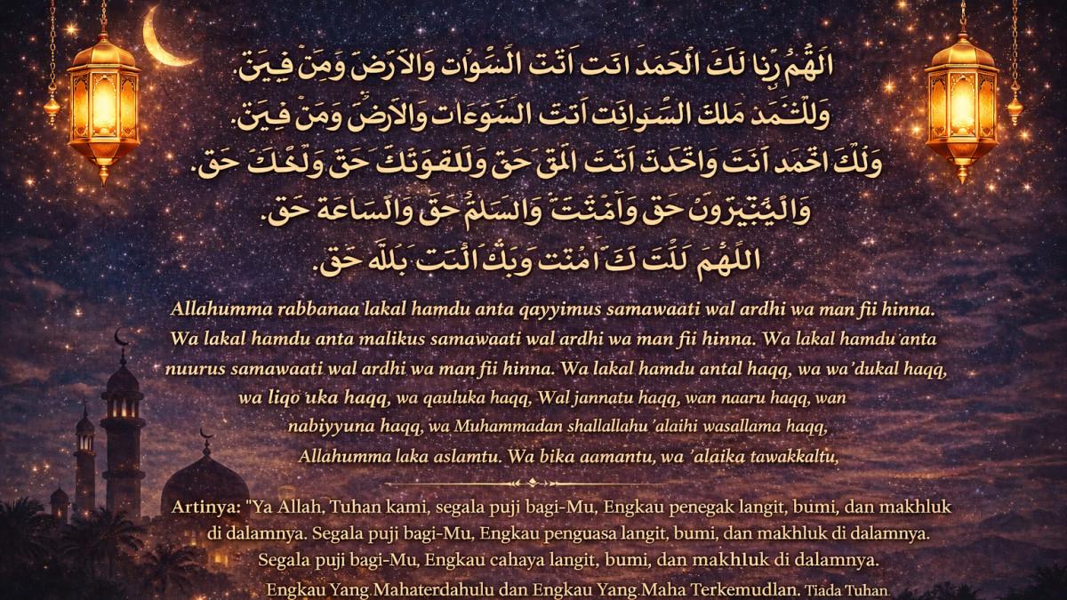 Artinya: “Ya Allah, Tuhan kami, segala puji bagi-Mu, Engkau penegak langit, bumi, dan makhluk di dalamnya. Segala puji bagi-Mu, Engkau penguasa langit, bumi, dan makhluk di dalamnya. Segala puji bagi-Mu, Engkau cahaya langit, bumi, dan makhluk di dalamnya. Segala puji bagi-Mu, Engkau Maha Benar. Janji-Mu benar. Pertemuan dengan-Mu kelak itu benar. Firman-Mu benar adanya. Surga itu nyata. Neraka pun demikian. Para nabi itu benar. Demikian pula Nabi Muhammad SAW itu benar. Hari Kiamat itu benar. Ya Tuhanku, hanya kepada-Mu aku berserah. Hanya kepada-Mu juga aku beriman. Kepada-Mu aku pasrah. Hanya kepada-Mu aku kembali. Karena-Mu aku rela bertikai. Hanya pada-Mu dasar putusanku. Karenanya ampuni dosaku yang telah lalu dan yang terkemudian, dosa yang kusembunyikan dan yang kunyatakan, dan dosa lain yang lebih Kau ketahui ketimbang aku. Engkau Yang Mahaterdahulu dan Engkau Yang Maha Terkemudian. Tiada Tuhan selain Engkau. Tiada daya upaya dan kekuatan selain pertolongan Allah.” (HR Bukhari dan Muslim)