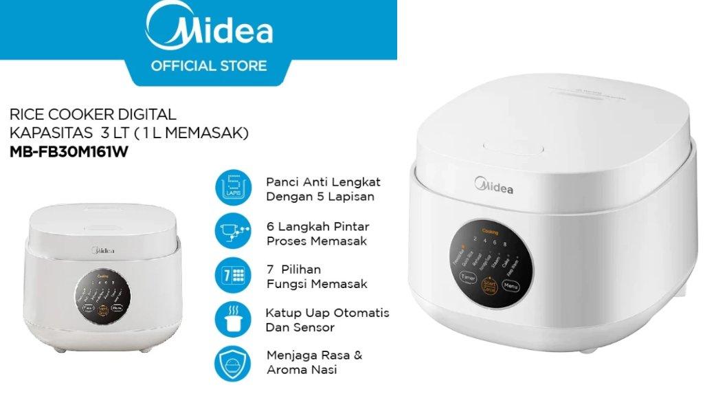 Midea Digital Rice Cooker MB-FB30M161W adalah salah satu produk penanak nasi digital yang mendapatkan rating tinggi, yaitu hampir sempurna 4,9 dari 5 bintang di berbagai platform e-commerce. Produk ini dikembangkan oleh Midea, perusahaan asal Tiongkok yang telah lama dikenal dalam industri elektronik rumah tangga. Produk-produk Midea mencakup kulkas, AC, mesin cuci, vacuum cleaner, dan juga magic com. Jaringan Midea telah menyebar ke berbagai negara, termasuk Indonesia.