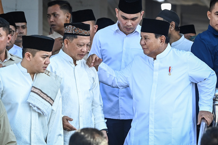 Selama salat Id, Prabowo berada di saf paling depan. Ia ditemani oleh Menteri Dalam Negeri Tito Karnavian dan Seskab Teddy Indra Wijaya.