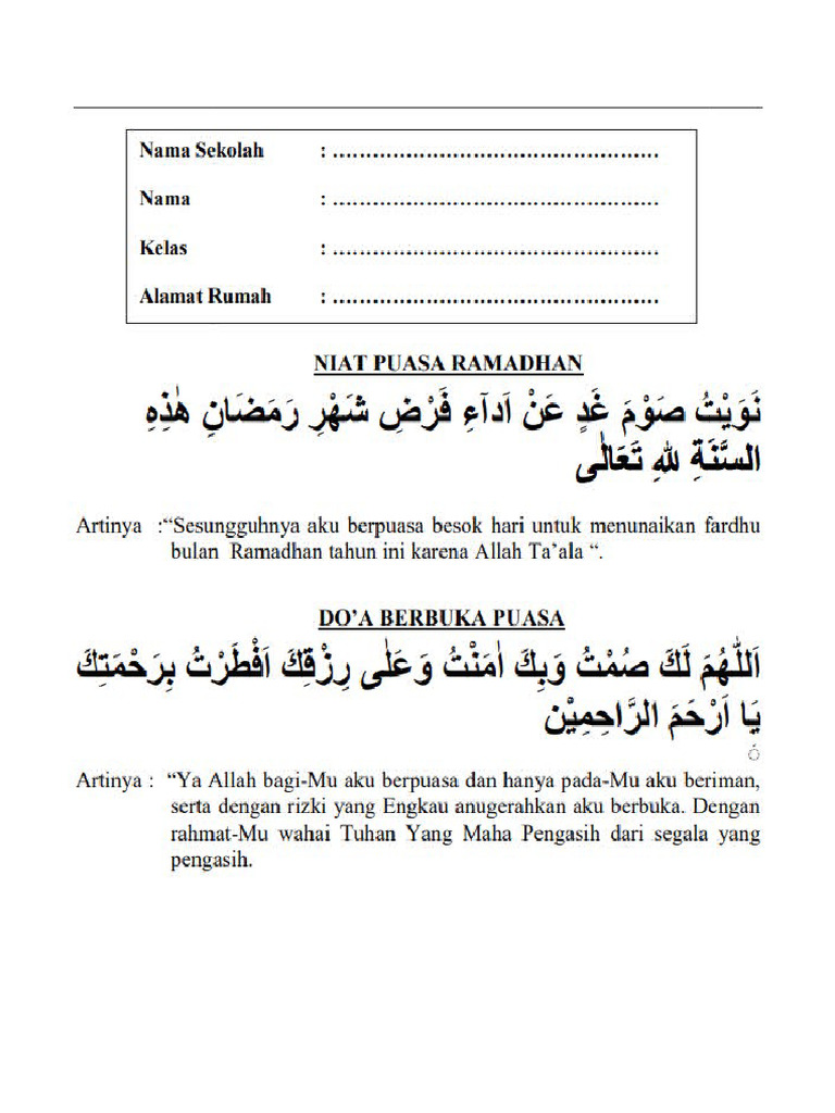 Artinya: “Ya Allah Dzat yang Maha Pemurah dari segalanya, untuk-Mu aku berpuasa dan dengan rizki dan kasih sayang-Mu aku berbuka.”