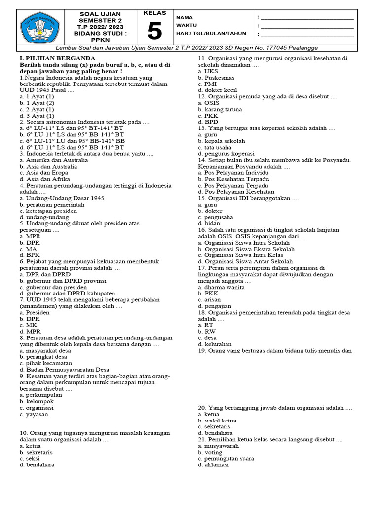 Latihan Soal Ulangan PPKN Kelas 5 SD Semester 2 Kurikulum Merdeka Tahun 2026